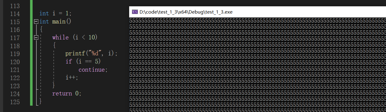 执行完continue后,返回(i<10)进行判断——陷入死循环