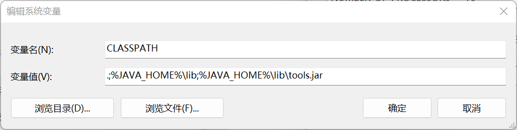 变量值为 .;%JAVA_HOME%\lib;%JAVA_HOME%\lib\tools.jar(从点开始)