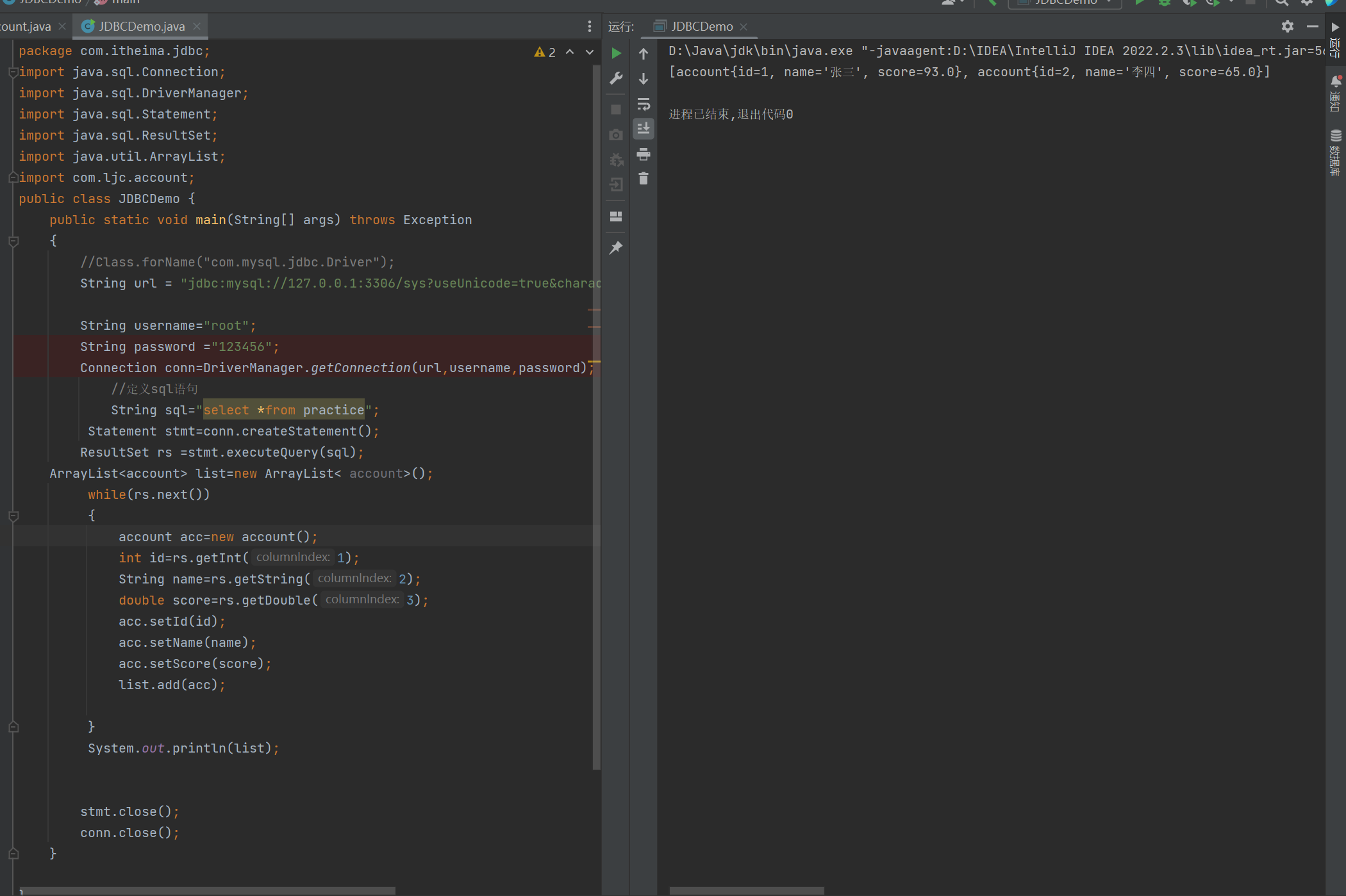 package com.itheima.jdbc; import java.sql.Connection; import java.sql.DriverManager; import java.sql.Statement; import java.sql.ResultSet; import java.util.ArrayList; import com.ljc.account; public class JDBCDemo { public static void main(String[] args) throws Exception { //Class.forName("com.mysql.jdbc.Driver"); String url = "jdbc:mysql://127.0.0.1:3306/sys?useUnicode=true&characterEncoding=utf-8&useSSL=false"; String username="root"; String password ="123456"; Connection conn=DriverManager.getConnection(url,username,password); //定义sql语句 String sql="select *from practice"; Statement stmt=conn.createStatement(); ResultSet rs =stmt.executeQuery(sql); ArrayList<account> list=new ArrayList< account>(); while(rs.next()) { account acc=new account(); int id=rs.getInt(1); String name=rs.getString(2); double score=rs.getDouble(3); acc.setId(id); acc.setName(name); acc.setScore(score); list.add(acc); } System.out.println(list); stmt.close(); conn.close(); } }