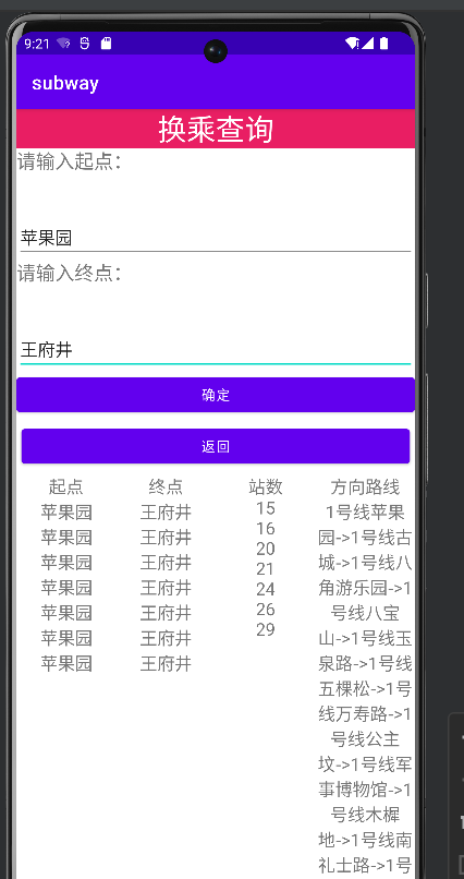 今天,我和我的搭档初步实现了安卓端的地铁系统,完成了线路查询、换乘查询和站点查询三个查询,并且成功显示出正确的数据