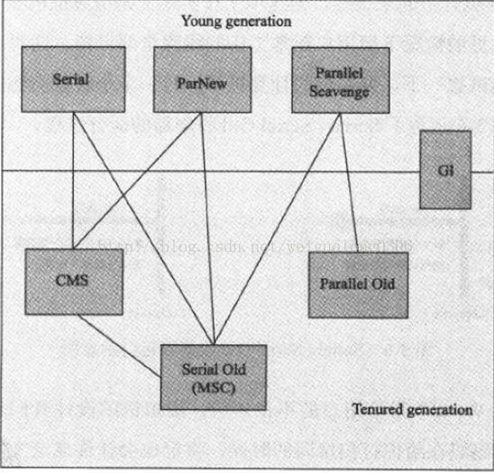 如上图所示, 每一个黑框中都是一个垃圾收集器, 对应特定的垃圾收集算法, 来挺高整体的垃圾收集效率。