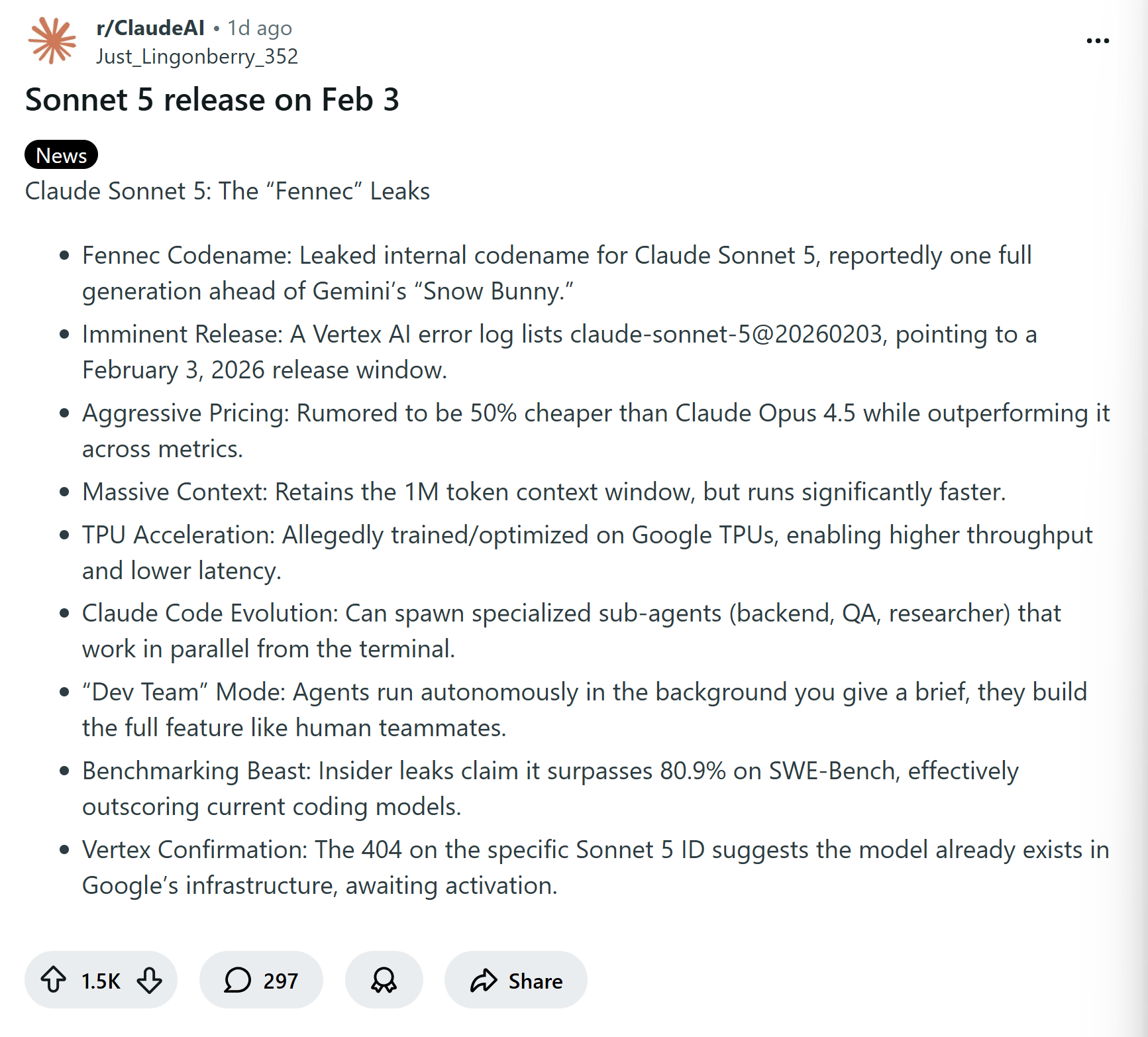 根据可靠泄露信息和行业传闻,Claude Sonnet 5(内部代号可能为"Fennec")预计于2026年2月3日左右发布,模型ID为claude-sonnet-5@20260203。最早传播的信息来源于Reddit。