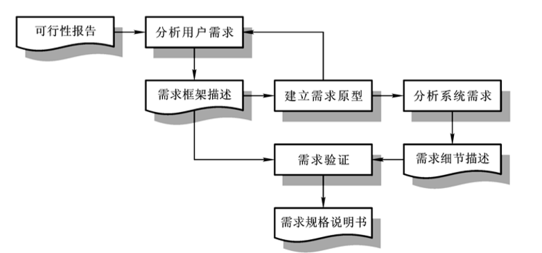 需求分析是对软件系统的后期分析,需要进行一系列的活动,包括:分析用户需求、建立 需求原型、分析系统需求和进行需求验证等,其活动流程如图所示。