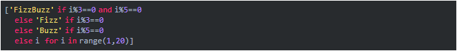 在这个测试中,我们需要编写一个程序来打印从1到20的数字。但如果是3的倍数,打印Fizz,如果是5的倍数,打印Buzz,如果同时是3和5的倍数,打印FizzBuzz,否则打印数字。 看起来我们必须使用循环和多个if-else语句。如果你尝试用其他语言来做,你可能需要写10行代码,但是使用Python,我们可以只用一行代码就实现FizzBuzz