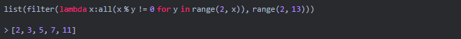 质数是一个只能被自身和1整除的数。例如:2、3、5、7等。为了在一个范围内生成质数,我们可以使用带有filter和lambda的list函数来生成质数。