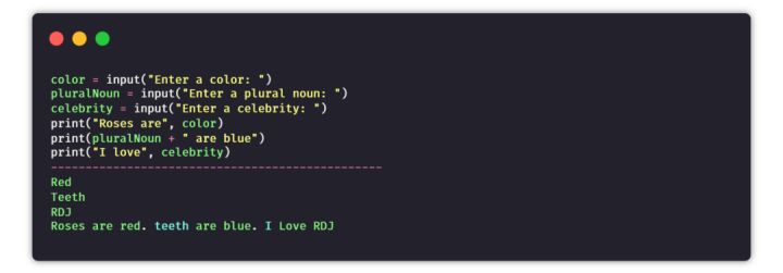 提示:以用户输入的名词、代词、形容词等作为输入,然后将所有数据添加到句子中,并将其组合返回。