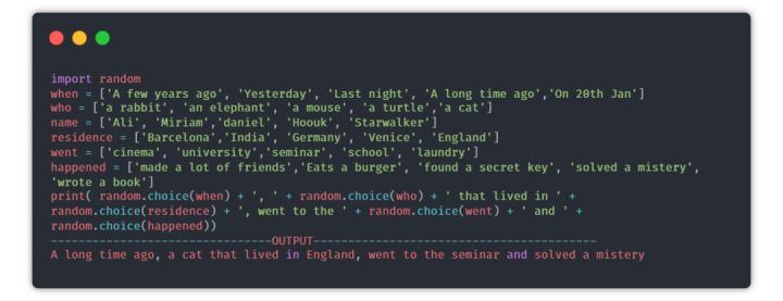 提示:random模块可以用来选择故事的随机部分,内容来自每个列表里。
