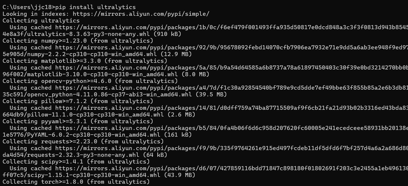第五步:安装YOLOv8及其依赖,在命令行输入以下命令:pip install ultralytics