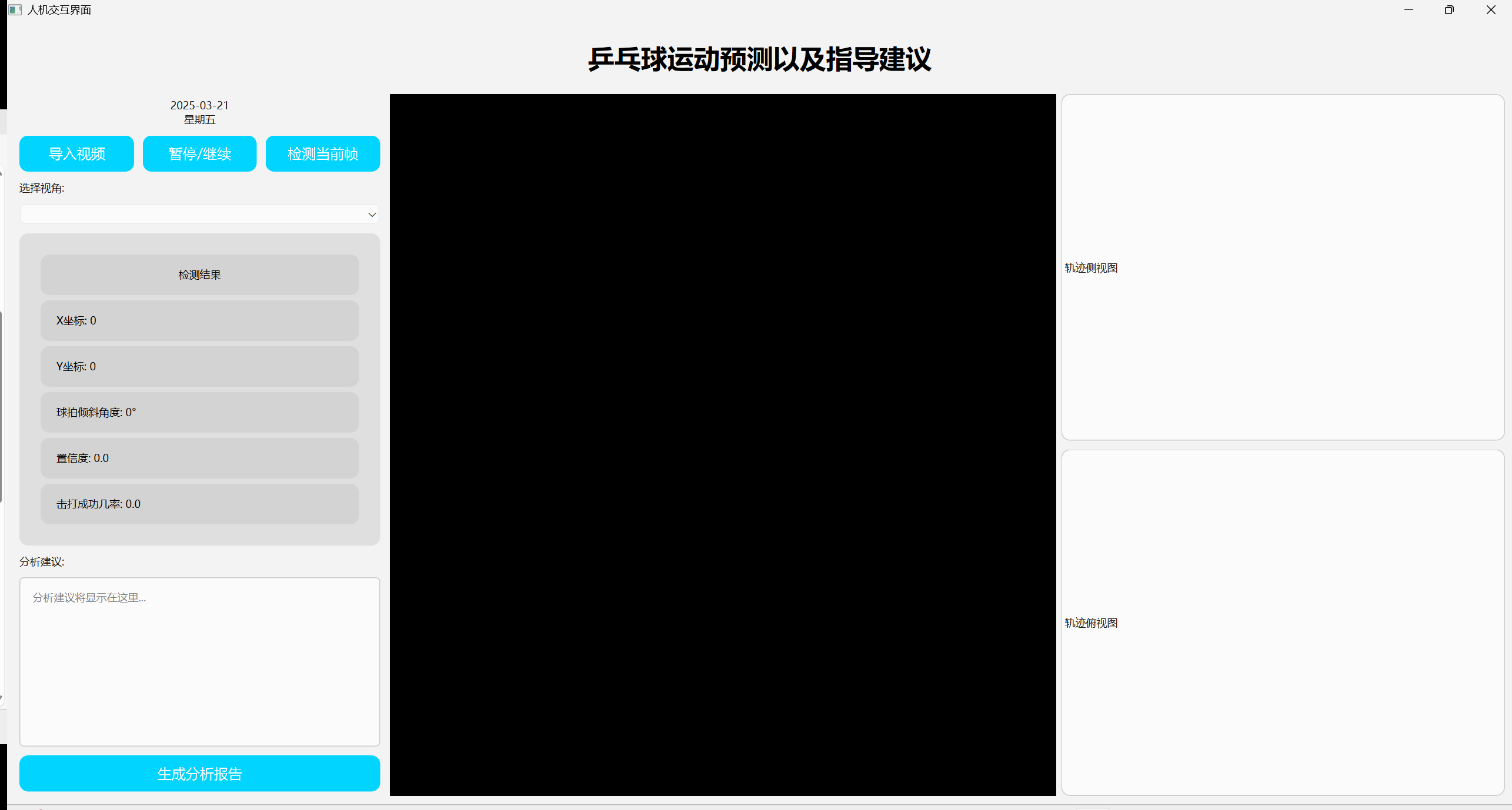 对于此题目我们的最初想法是调用官方指定的大模型飞桨和千帆来完成对乒乓球运动轨迹进行预测、对运动员进行动作分析等内容,我们完成了前端程序页面的搭建,我们将需要展示的内容框放置在了页面上,例如视频的播放框、分析内容、建议展示框等等,具体代码和页面如下:
