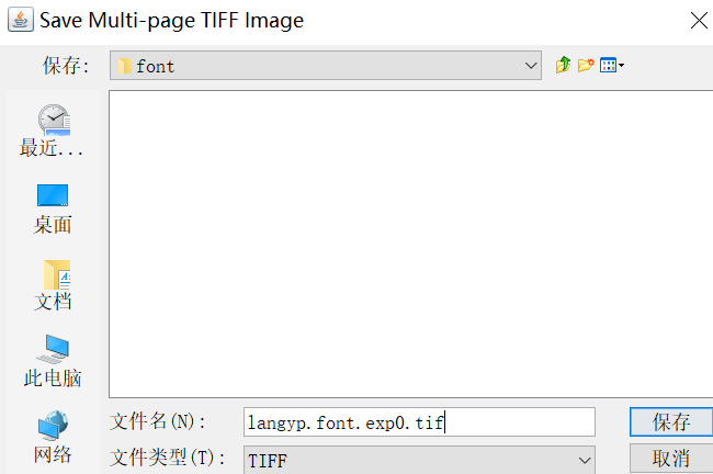 然后保存文件名到指定目录,我这里保存的文件名为: langyp.font.exp0.tif