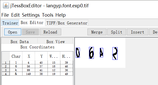 点击jTessBoxEditor工具的Box Editor选项,点击下方的open选项,打开刚刚生成的langyp.font.exp0.tif文件,结果如下:
