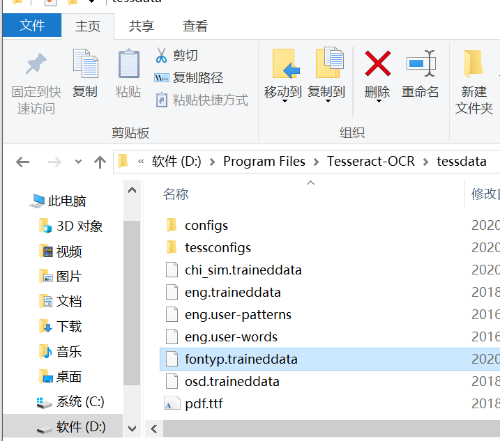 12、将fontyp.traineddata文件拷贝至Tesseract-OCR文件夹里的tessdata语言包文件夹里