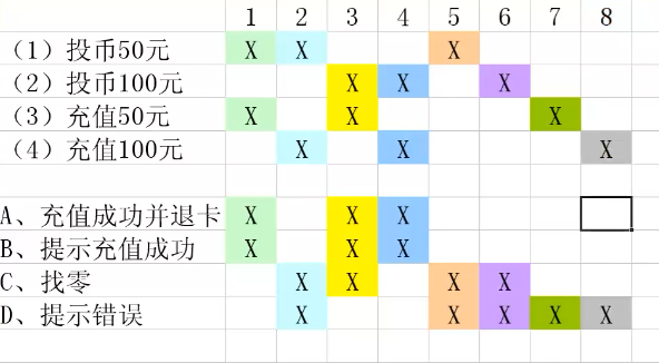 步骤六 根据组合画出判定表:把上面可以组合的所有情况,画在判定表里,每一条就是一个用例