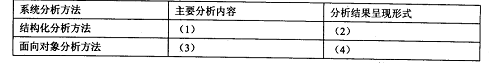 ??在系统分析阶段,结构化分析和面向对象分析方法主要分析过程和分析模型均有所区别,请将(a)?~?(g)各项内容填入表2-1?(1)~?(4)处对应位置。