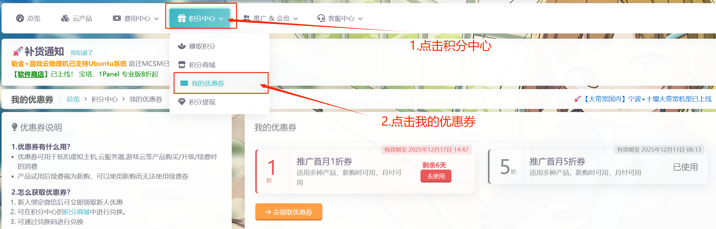 点击积分中心、我的优惠券,即可看到自己拥有的优惠券;