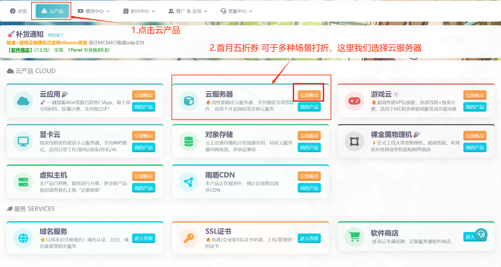 当然,雨云发放的优惠不只是这一点,后面的文章会讲其他方面的优惠、云产品试用、游戏服务器搭建等。