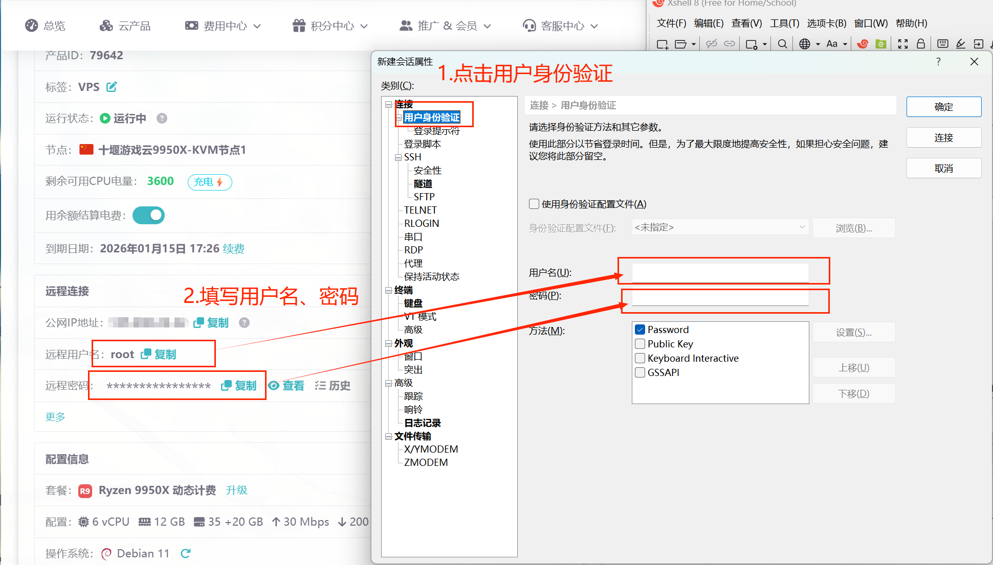 在Xshell点击用户身份验证,填写管理页面的用户名、密码。