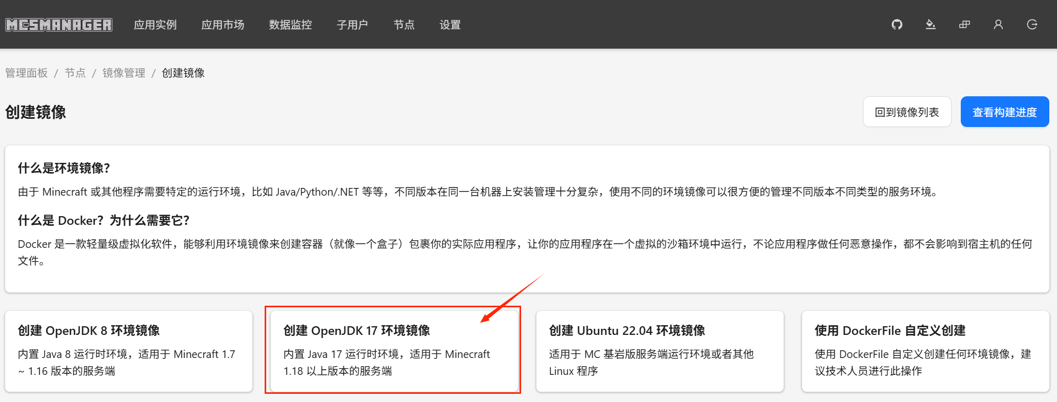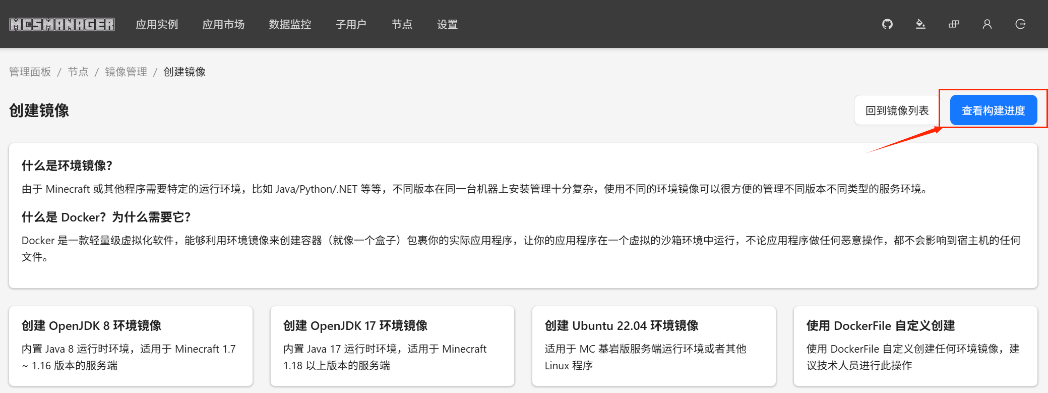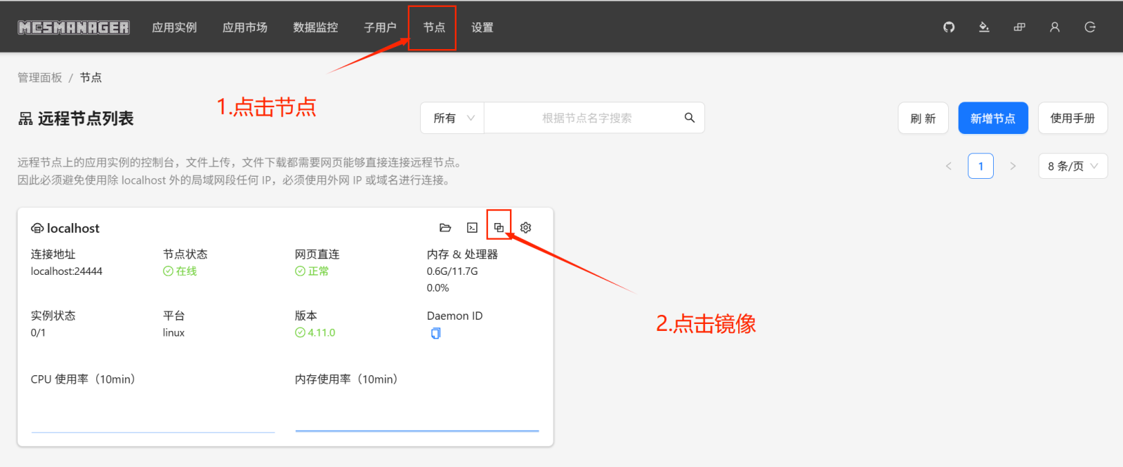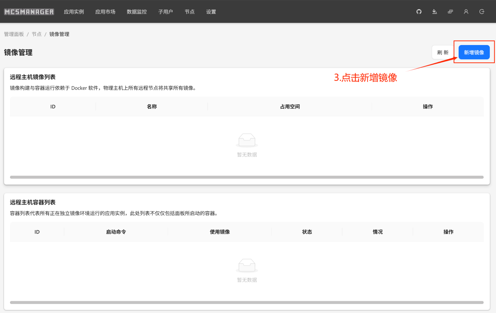 登录MCSM面板后点击节点-镜像管理-新增镜像。