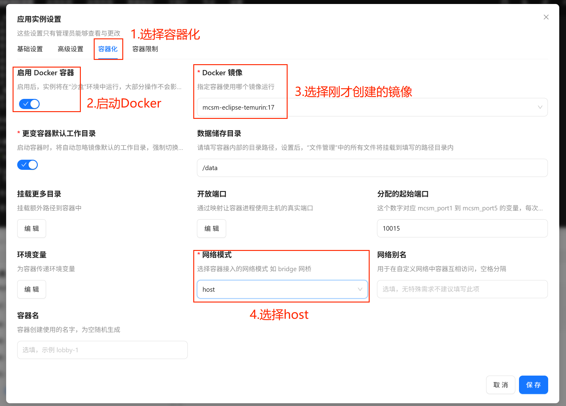 选择容器化-启动Docker容器-选择刚才创建的镜像-网络模式选择host,保存。