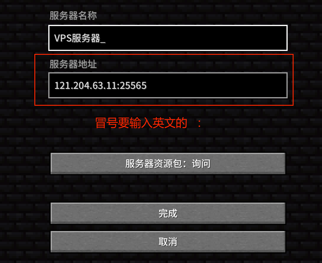 在服务器地址粘贴我们在雨云管理游戏云界面复制的 公网IP:25565。