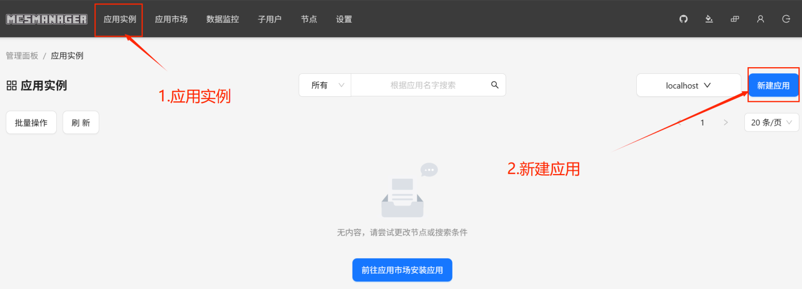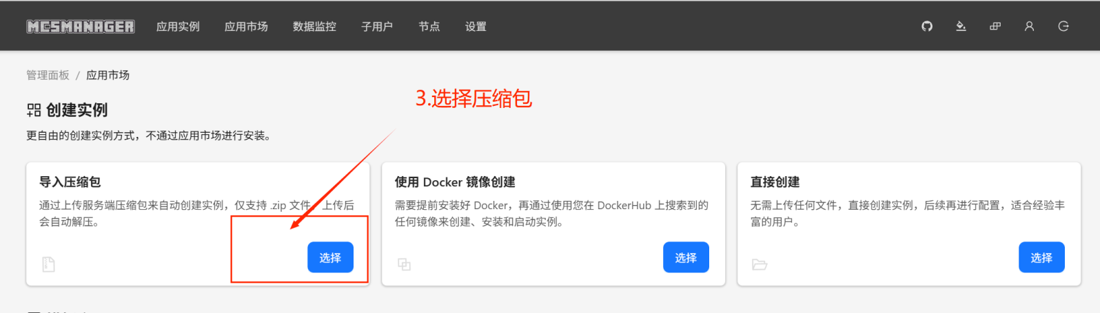 依次点击 应用实例-新建应用-选择压缩包-选择节点。