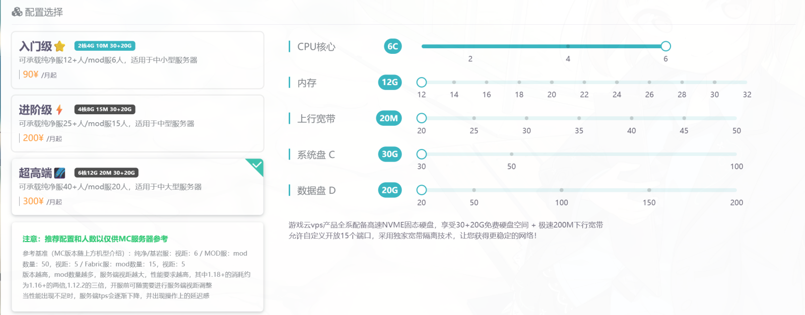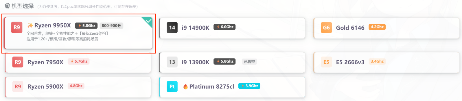 机型的选择根据自己的需求来选择,mod越多的服务器要求的配置越高,这里我选择Ryzen 9950X(最高配置之一,大家根据需求选择,不用选太贵的,我这里是想用一折券体验一下高配置服务器)。