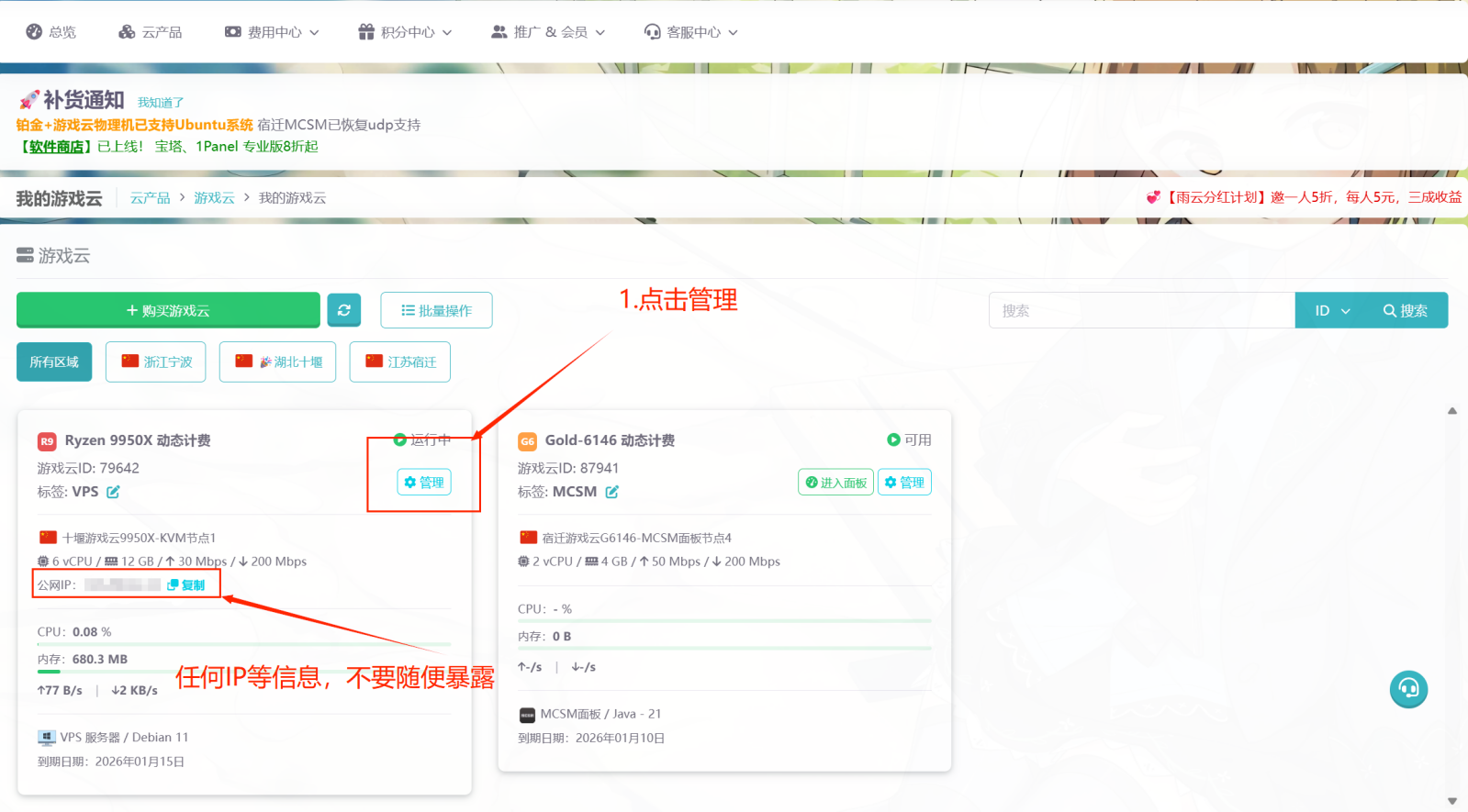 本篇旨在讲解了 雨云服务器 的使用方法——游戏云 **VPS服务器(此次演示提供独立IP的服务器) **搭建 我的世界服务器。