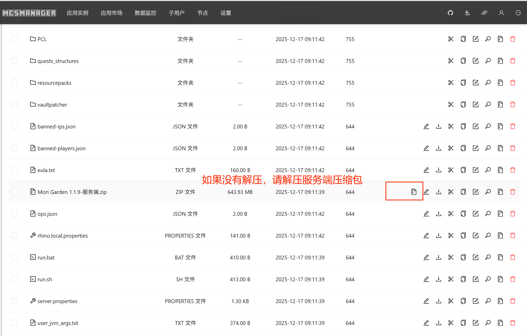 文件夹如图所示,有很多文件,代表服务端压缩包自动解压完成。