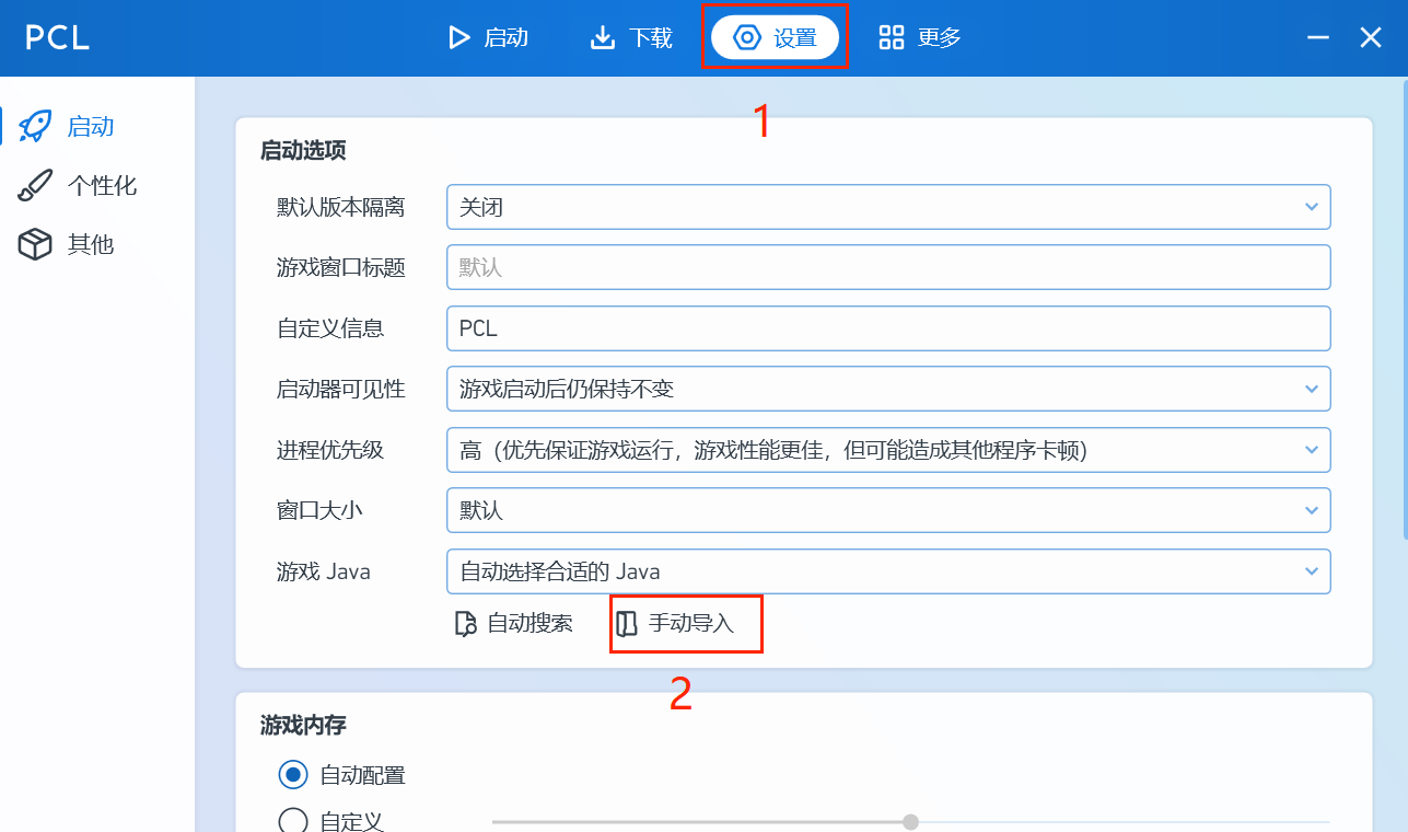 如果启动游戏提示没有安装Java的化可以手动配置一下,打开启动器后点击设置、手动导入。