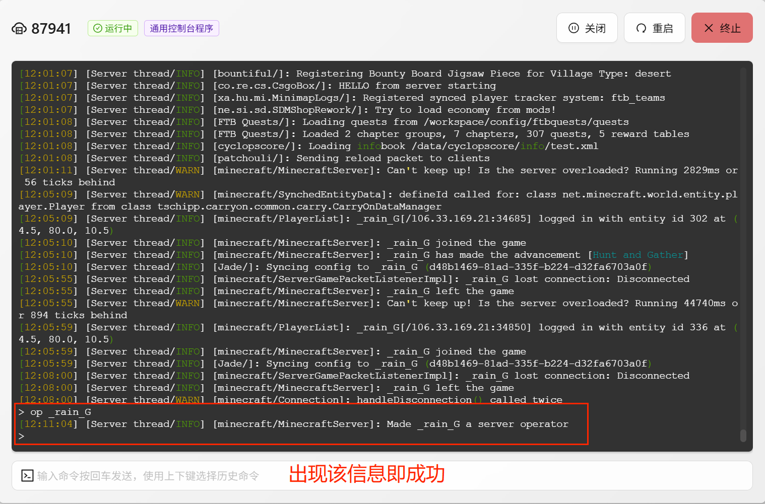 回到终端,在控制台输入’op 玩家名称’即可给予管理员身份。