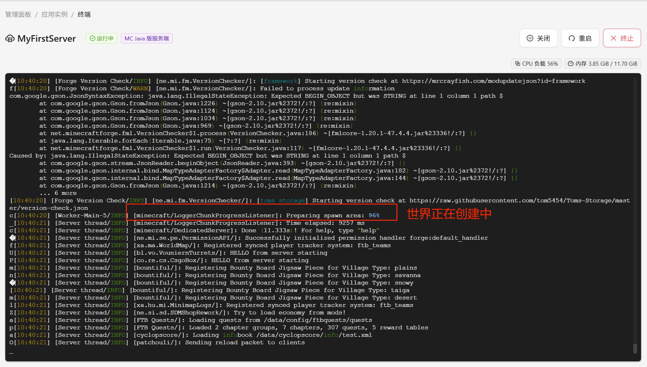 出现该信息即证明初始化完成,正在创建世界,等待完成,即可联机游玩。