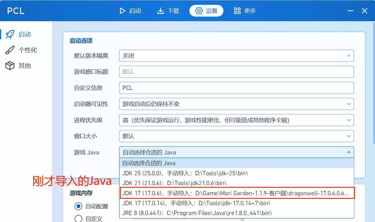 3.手动导入Java(启动游戏出现为找到合适的Java的情况下需要配置)