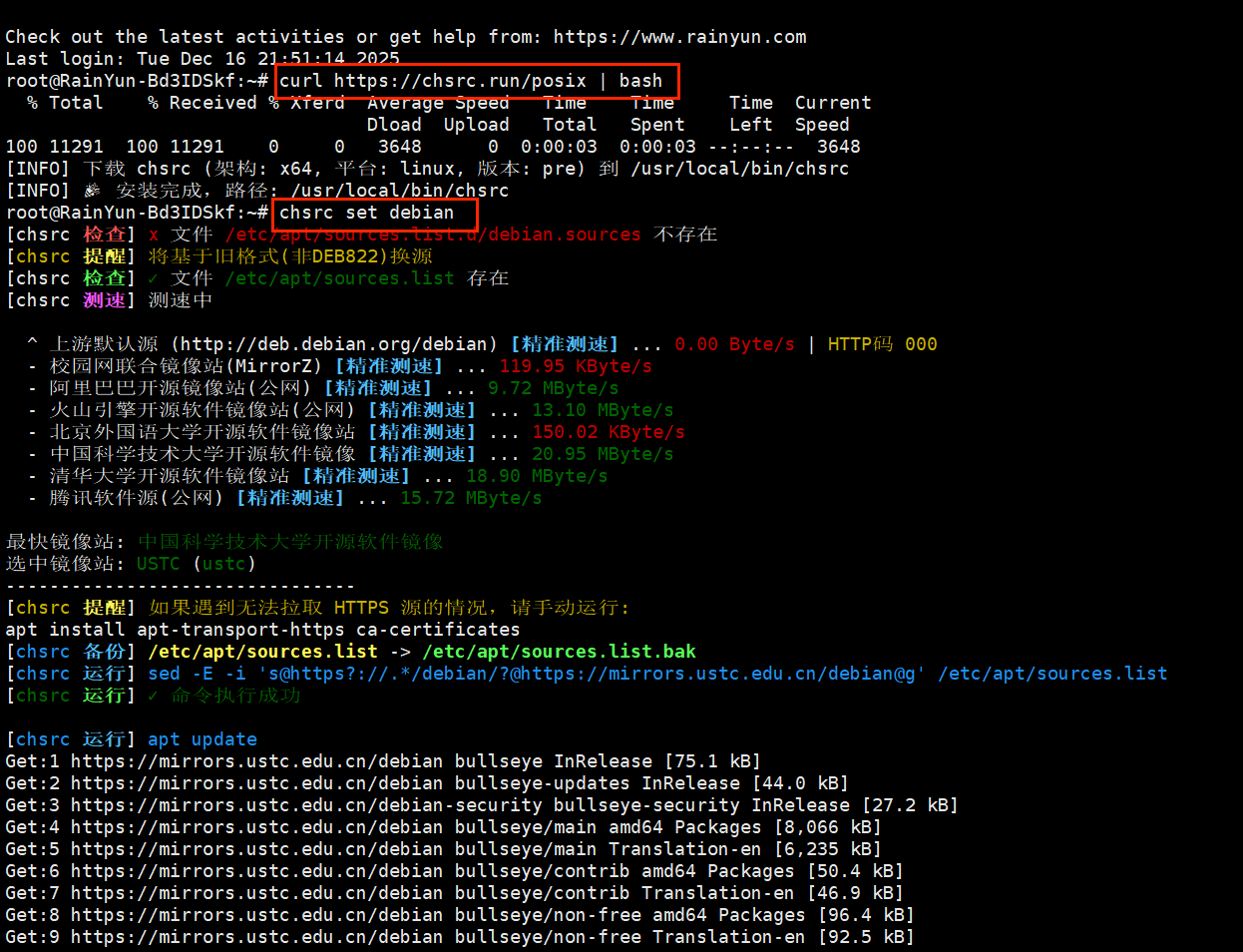 apt换源来加快下载速度,在SSH终端,依次输入下面的指令