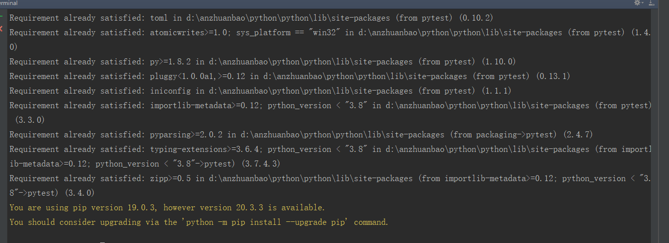 第一步:直接在PyCharm中安装,将控制台切换到命令行的状态,输入pip install pytest--》回车,如果出现以下界面,基本就是安装成功了