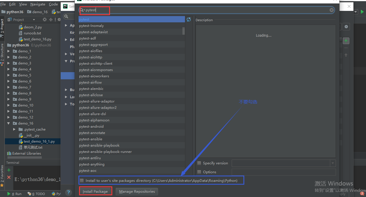 第一步:打开PyCharm,点击file--->settings---->找到项目解释器(Project interpreter)----》点击+号----》搜索pytest,直接install package即可