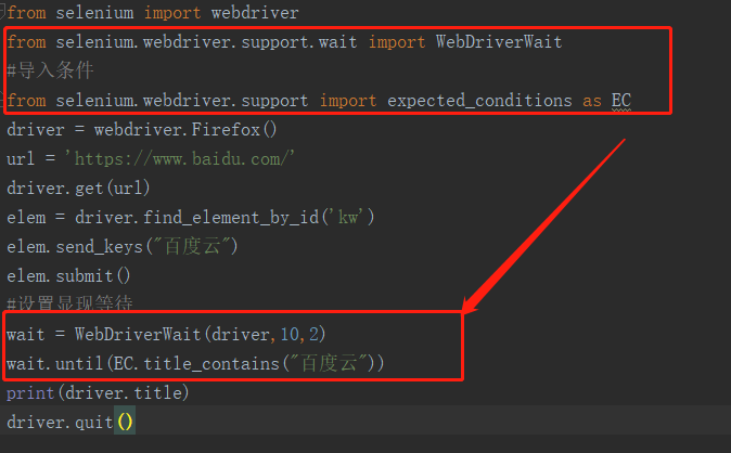 显性等待:程序每隔x秒查看一次,如果条件符合,则执行下一步操作,否则继续等待,知道等到超时报错(每需要用到一次,就会启动一次,不仅可以查找元素,还可查找其他)。通常有两个时间,一个是等待时间,一个是论循时间,通常结合until和not_nutil使用。