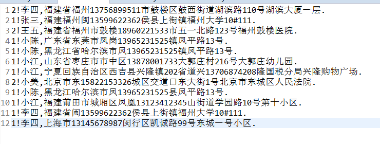 输入:1!李四,福建省闽13599622362侯县上街镇福州大学10#111.