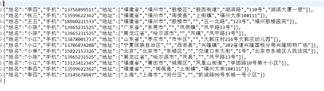 输出:{"姓名":"李四","手机":"13599622362","地址":["福建省","","闽侯县","上街镇","福州大学10#111"]}