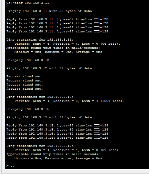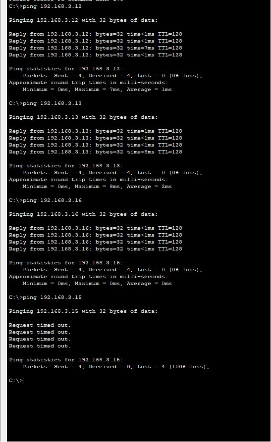 3)测试。测试结论:相同VLAN,主机彼此可以互相ping通;不同VLAN,主机彼此不能互相ping通。