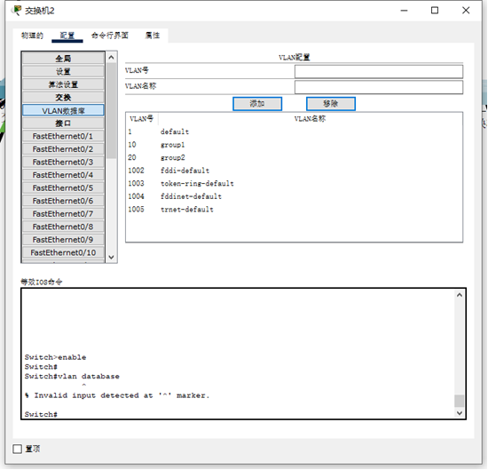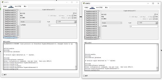 5跨交换机的VLAN划分,并测试网络连通性。。 1)先分别在不同的交换机上设置两个不同的VLAN 10和20。