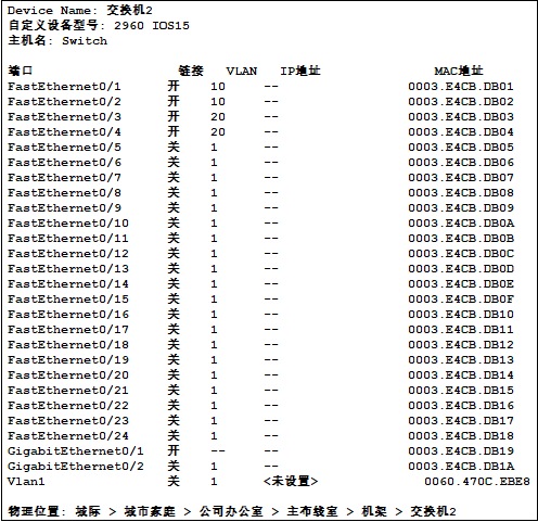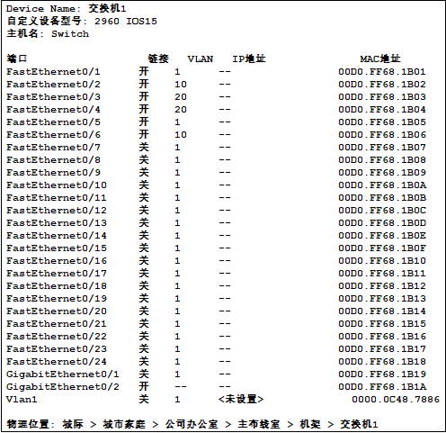 2.为设备设置IP地址,并测试网络连通性。(参见上次实验) ――截图(测试2个图、VLAN信息1个图) 交换机是二层设备,给交换机的VLAN 1配置IP地址。在没有设置VLAN前,所有的端口都默认属于VLAN 1,所以VLAN 1也叫做管理VLAN,显然VLAN1的IP地址就是交换机的IP地址。