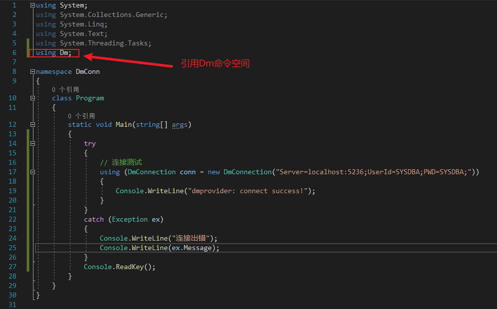 using (DmConnection conn = new DmConnection("Server=localhost:5236;UserId=SYSDBA;PWD=SYSDBA;"))