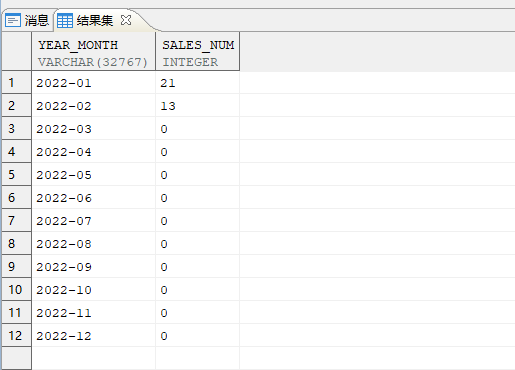 -- 利用CONNECT BY level <= 12动态生成12行月份记录(2022年只有1/2月有销售)