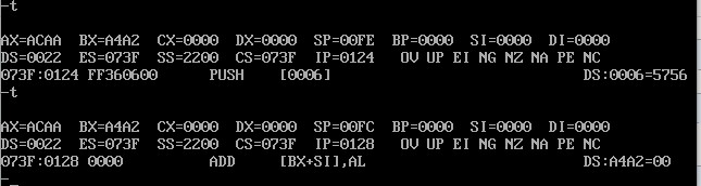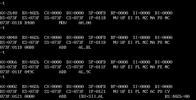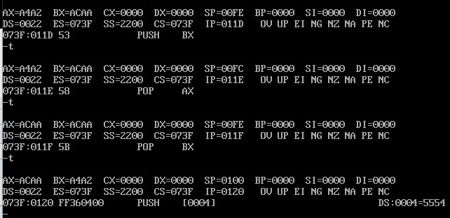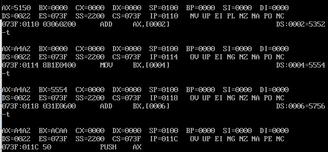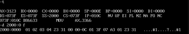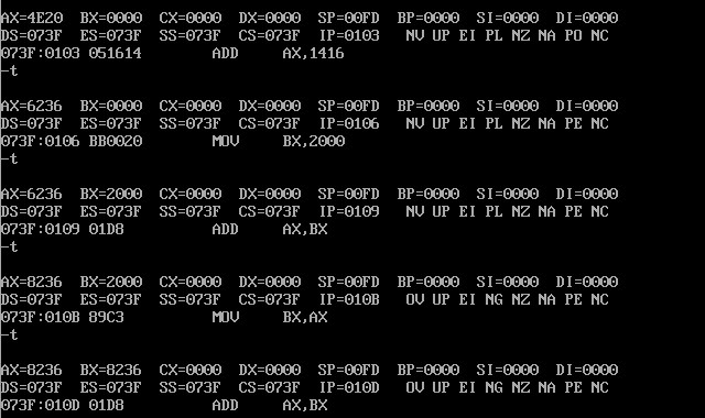 用A命令将指令写入内存,用T命令逐条观察CPU中相关寄存器内容的变化