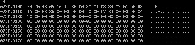 我们可以将073f:0121的存储的内容与刚才输入的汇编指令的机器码进行一一对应,可以发现,这些存储单元存储的就是汇编指令的机器码