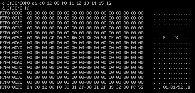 PC机主板上的ROM中写有一个生产日期,在内存FFF00~FFFFFH的某几个单元中,请找到这个生产日期并试图改变它。