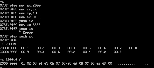 使用a命令输入7行指令并用e指令修改2000:0~2000:f单元的值