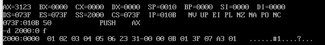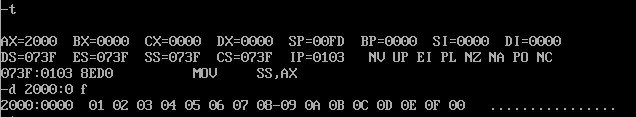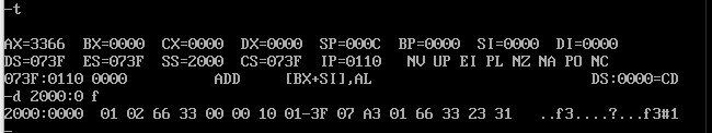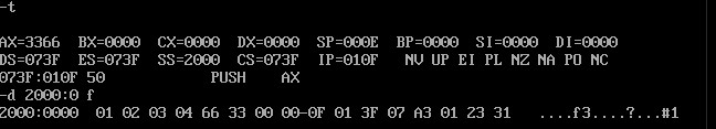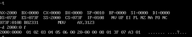 然后用t命令监察,再用d指令观察2000:0 f内容的变化