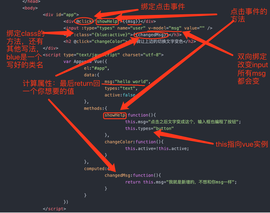 this.msg="点击之后文字变成这个,输入框也编程了按钮";