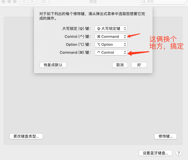 首先啊,从windows转到mac真心不习惯,于是想把ctrl和windows键互换下位置是不是就好了,我的键盘是标准键盘,我找到了方法。